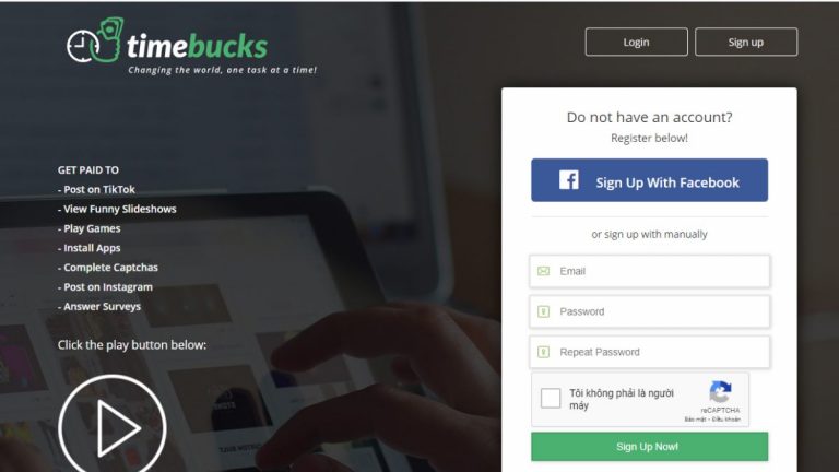 Timebucks là nền tảng website chuyên phân phối các cuộc khảo sát online, các quảng cáo và nhiều dịch vụ quảng cáo khác. Người dùng tham gia vào Timebucks có thể kiếm tiền online bằng cách hoàn thành các cuộc khảo sát, xem quảng cáo cũng như hoàn thành các nhiệm vụ khác. Và hiện Timebucks đang có chiến dịch cho phép người dùng sử dụng tài khoản Tik Tok của mình để kiếm tiền trên Timebucks. Nếu bạn có 1 tài khoản Tik Tok với lượng follow lớn thì đây quả là 1 công việc rất tiềm năng.