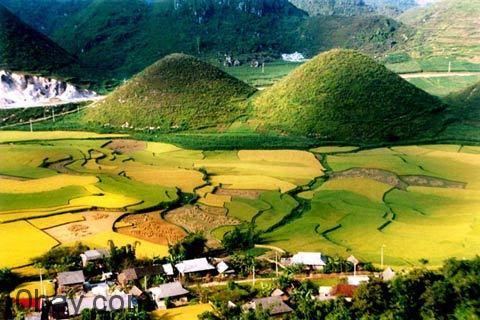 Núi Đôi Quản Bạ: Núi Đôi Quản Bạ có hình dáng tròn trịa, căng tràn giống như bộ ngực căng tròn của người thiếu nữ mới đôi mươi. Núi đá trùng điệp đan xen những ruộng bậc thang tạo nên vẻ rất mực hài hòa khiến du khách phải ngỡ ngàng trước vẻ đẹp của tạo hóa.