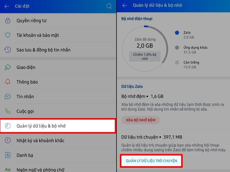 Nếu bạn có nhiều cuộc trò chuyện và cần xóa chúng, bạn có thể xóa nó cùng một lúc mà không tốn mấy thời gian. Zalo cho phép người dùng xóa bớt những thứ không cần thiết để giảm tải dung lượng dữ liệu bộ nhớ. Bạn hãy truy cập Zalo và vào phần Cài đặt > Chọn Quản lý dữ liệu và bộ nhớ > Quản lý dữ liệu trò chuyện > Xóa