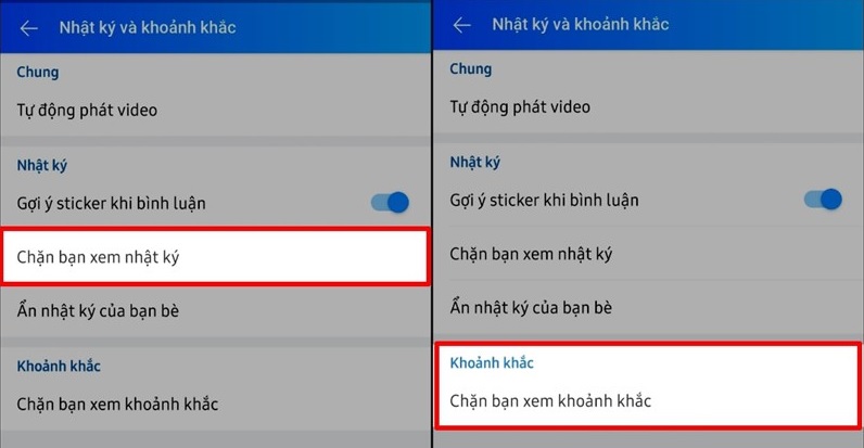 - Bạn vào Cài đặt > Nhật Ký và khoảnh khắc. Vào mục Chặn bạn xem nhật ký > Thêm tên người đó vào đây.
