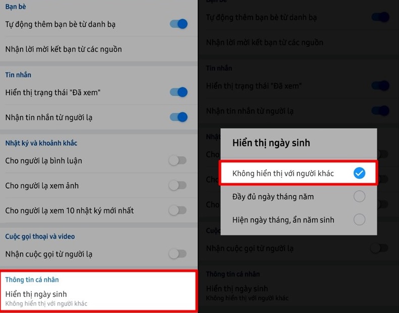 Khi sử dụng mạng xã hội như Zalo, Facebook, bạn có thể bị lộ thông tin cá nhân và gặp phiền phức với chúng. Nhiều người có thể biết được ngày sinh, số điện thoại của bạn và gọi đến làm phiền. Để ẩn đi những thông tin bạn không muốn lộ ra, bạn hãy vào Zalo và chọn Cài đặt > Quyền riêng tư. Tại mục hiển thị ngày sinh, bạn chọn vào “Không hiển thị với người khác”