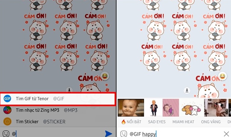 Để gửi tập GIF, bạn gõ @ khi nhập nội dung tin nhắn > Chọn GIF từ Tenor > Nhập cảm xúc bạn muốn biểu lộ.