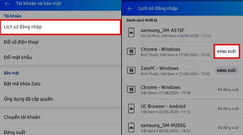 Bạn mở Zalo, vào phần Cài đặt > Tài khoản và bảo mật > Lịch sử đăng nhập > Chọn Đăng xuất bên cạnh thiết bị bạn muốn thoát.