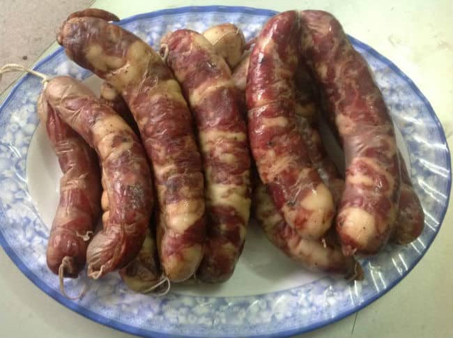 Hàng năm vào dịp tết đến khắp các bản làng vùng cao lại nô nức rủ nhau mổ lợn để ăn trong dịp tết dài ngày. Khi mổ lợn bao giờ người ta cũng dành lại ít lòng non và thịt để làm lạp xưởng, còn nhân lạp xưởng thì được dùng loại thịt nửa nạc nửa mỡ rửa sạch rồi lọc bỏ lớp bì, thái thành miếng nhỏ sau đó mang ướp muối, đường, bột ngọt, rượu, nước gừng, và một số gia vị đặc trưng của vùng núi rừng Tây bắc. Vào những ngày lạnh trời mà có món này thì đúng là tuyệt vời, thật ngon miệng nếu nhâm nhi thêm chút rượu táo mèo của Tây Bắc.