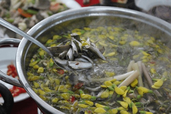 món lẩu cá linh bông điên điển hương vị đúng điệu của miền Tây sông nước. Khi cánh đồng miền Tây vàng rực bông điên điển, những con cá linh theo dòng nước lũ đổ về là lúc người dân ở đây được thưởng thức món ăn đậm chất hương đồng gió nội.