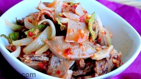 Món gỏi ngon dễ làm từ lưỡi lợn mềm thơm, nhiều thịt sau khi luộc chín rồi cắt lát mỏng trộn chung với hành tây bào mỏng, rau răm và nước mắm ớt tỏi chua cay tạo hương vị thơm ngon hơn cho món lưỡi lợn thường ngày. Món gỏi ngon bởi cách trộn các gia vị vừa miệng và dùng kèm bánh tráng nướng giòn thơm mùi mè thú vị vô cùng.