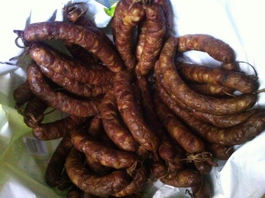 Một món khô nhậu ngày Tết khá hấp dẫn tiếp theo là lạp xưởng hun khói, mà nổi tiếng nhất là lạp xưởng Cao Bằng. Lạp xưởng hun khói Cao Bằng có mùi của nắng vùng cao, mùi của khói bã mía, thoảng mùi gừng, mùi rượu, mùi mắc mật thơm một cách đặc biệt. Chế biến cầu kỳ, làm từ thịt lợn mán đen nên chắc, ngọt, có mỡ cũng không ngán. Khi ăn có vị dai của lòng, vị ngọt của thịt nạc, vị béo của mỡ hòa quyện với nhau, ăn thật ngon miệng. Món này phù hợp để ăn kèm cơm, làm món nhậu đãi khách hoặc làm quà tặng độc đáo. Lạp xưởng hun khói Cao Bằng được chế biến phong phú, có thể nấu xôi, cơm chiên, trứng đúc thịt, trứng cuốn lạp xưởng,…hoặc chấm với mù tạt vàng làm món nhậu.