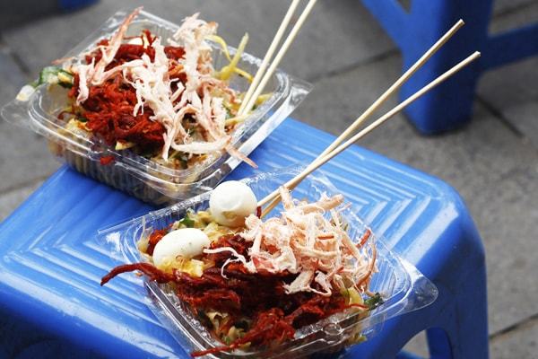 Thật thiếu sót nếu bỏ qua hàng bánh tráng trộn trên phố Hàng Trống. Đây là một trong những món ăn ngon khu phố cổ Hà Nội nhất định phải thử. Chỉ đơn giản là chiếc xe cùng những chiếc ghế nhựa nhỏ nhưng quán lúc nào cũng đông đúc khách. Bánh tráng trộn so với công thức của Sài Gòn có một số biến tấu để hợp vị người miền Bắc như không quá ngọt, nước sốt không hắc, không quá cay, không dùng muối tôm và không dùng tép. Đặc biệt, bánh tráng ở đây được cho siêu nhiều bò khô và mực nên sẽ khiến bạn vô cùng thích thú.