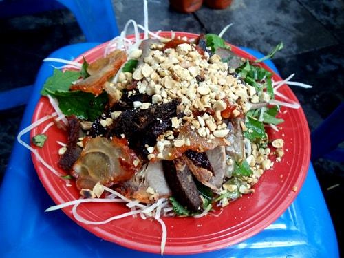 Nếu hỏi địa chỉ ăn nộm bò khô ngon tại Hà Nội, chắc chắn sẽ phải nhắc đến phố Hồ Hoàn Kiếm, con phố ngắn nhất Hà Nội. Đĩa nộm bò khô tại đây bên cạnh những nguyên liệu quen thuộc như thịt bò khô cắt miếng, đủ đủ xanh, rau thơm, lạc rang còn có thêm cả thịt quay thái mỏng và vài miếng mề quay ăn giòn ngon đầy hấp dẫn. Tất cả được trộn đều cùng nước trộn vị chua ngọt rất vừa miệng. Đây là một trong những món ăn ngon khu phố cổ Hà Nội nhất định phải thử, cực kì hút khách, nhất là vào những ngày hè.