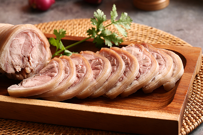 Bên trên là thức ăn,nguyên liệu quen thuộc như rau thơm, dưa chuột, dồi tiết, tiếp đó là chả cốm, thịt luộc, bún bánh cắt miếng nhỏ; Nhấn nhá ở giữa là đậu chiên phồng.