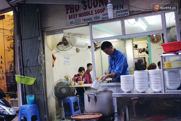 Quán phở khá nổi tiếng, nhiều người biết đến nó qua cái biệt hiệu lừng lẫy “phở bưng”. Một tay bưng bát, một tay cầm đũa, khỏi cần thìa, nước canh thì húp xì xụp. Đó chính xác là phong cách thưởng thức đúng chất “phở bưng” Hà Nội, hơi vất vả nhưng vẫn ngon miệng lạ kì. Nước phở ở đây trong veo song vẫn đậm đà, thịt bò chín thái mỏng, mềm, bỏ thêm nhiều hành hoa vào khiến bát phở càng dậy mùi thơm hấp dẫn.