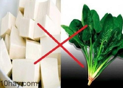 Trong rau chân vịt có chứa acid oxalic, còn trong đậu phụ lại có chất magnesium chloride, calcium sulfate. Khi nấu cùng nhau 2 chất này sẽ kết hợp tạo thành magnesium oxalate và calcium oxalate, chất này được minh chứng ảnh hưởng tới sự hấp thụ canxi của cơ thể và còn dễ bị kết sỏi. Do vậy, chúng được xếp vào những thực phẩm kỵ nhau bạn không nên nấu chung.