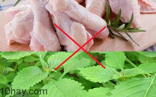 Thịt gà là một trong những món ăn phổ biến của người Việt. Tuy nhiên, có thể trong khi sử dụng thịt gà vô tình không để ý thì việc ăn cùng rau kinh giới là chuyện khá bình thường. Nhưng sự kết hợp giữa chúng lại là một trong những cặp thực phẩm kỵ nhau. Lý do bởi thịt gà phong mộc về tạng can, kinh giới lại có vị cay ấm phá kết khí (ngăn không cho phong khí tụ) hạ ứ huyết. Bởi vậy, khi kết hợp cùng nhau tất sẽ ảnh hưởng đến can phong, sinh chứng chóng mặt, ù tai, run rẩy cả người hoặc đầy bụng khó tiêu.