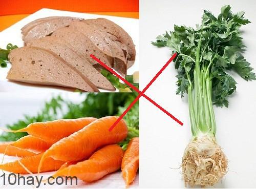 Rau cần, cà rốt và gan động vật cũng là những loại thực phẩm phổ biến. Tuy nhiên, khi kết hợp chúng vói nhau sẽ tạo ra nhiều phản ứng gây hại cho cơ thể. Lý do bởi gan động vật có hàm lượng đồng, sắt và một số kim loại khác khá cao, các ion kim loại rất dễ làm cho vitamin C có trong rau, quả, củ này bị oxy hóa và mất tác dụng cung cấp chất dinh dưỡng. Đối với trẻ em, khi ăn chung những loại thực phẩm này sẽ làm giảm sự hấp thụ sắt vào cơ thể gây thiếu máu.