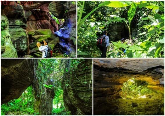 Một dải đồi xanh thẳm toàn bụi rậm, dây leo phủ kín với vài mỏm đá đen ngòm ẩn hiện. Từng vách đá cao vút được dòng nước chạm khắc hàng vạn đường vân mềm mại phủ kín dây leo, hang đá hun hút thâm trầm, mát lạnh kỳ quái dễ làm du khách sởn gai ốc nếu đến một mình. Hang Dơi thực chất là hai hang kề nhau, chia theo vị trí mà dân địa phương gọi là hang cao, hang thấp. Hang thấp sập vòm, vách cao hơn 10m, mở rộng dần khi đi vào trong với đoạn rộng nhất hơn 20m. Đứng tại đây nhìn lên, du khách sẽ thấy nắng chiếu lọt qua hàng rào dây leo đan cài chi chít trên mái rọi xuống đáy hang từng vùng sáng lung linh, huyền ảo. Trong hang, hơi đá phả ra mát lạnh, tĩnh mịch đầy vẻ huyền bí, dễ mê hoặc bất cứ khách bộ hành nào ưa cảm giác khám phá mạo hiểm.