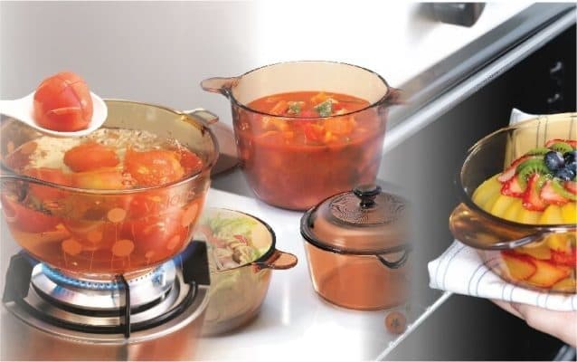 Ví dụ như bộ nồi Visions VSD-3.5-FV có chất liệu gốm thủy tinh không gây phản ứng hoá học nên không hấp thụ mùi vị hay vết bẩn từ thực phẩm, giữ vệ sinh và độ sáng bóng cao cho nồi.