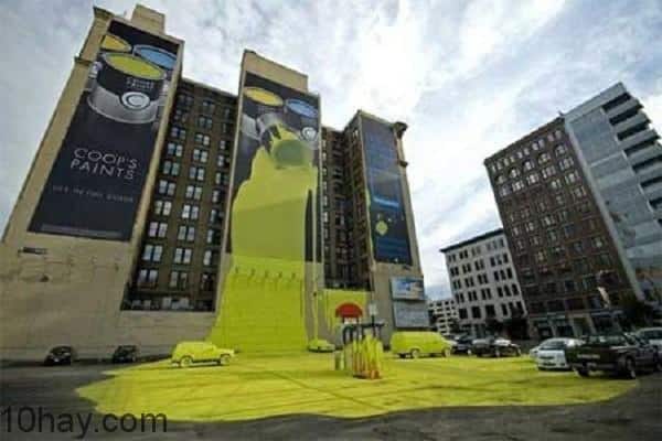 Một bức tường phủ lớp sơn màu vàng đang chảy xuống và nhuộm vàng mọi thứ xung quanh. Tọa lạc ở phía bắc tòa nhà Atlas, thành phố Chicago, bang Ohio, đây là phương thức quảng cáo cho dòng sơn mới của hãng sơn Coops.