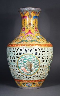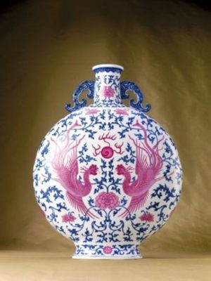 Chiếc bình cổ được lên men màu hồng này có tên là Moonflask đã có từ thế kỳ 15. Chiếc bình cổ này cao 48,9 cm, trên thân bình được chạm khắc: 2 con phượng hoàng và một viên ngọc màu đỏ. Vua Càn Long đã đặt bút tích 6 lần lên chiếc bình. Nhờ đó mà giá của cổ vật này càng được đẩy lên cao. Năm 1987, nó đã được chào bán tại Hong Kong với mức gá 15,1 triệu USD.