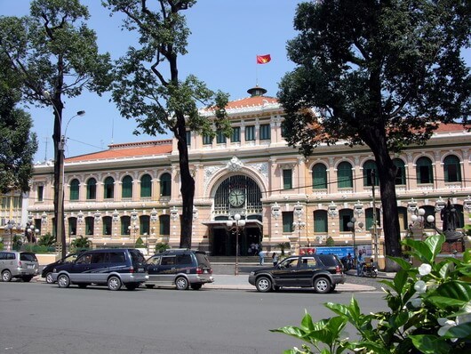 Thêm một điểm nằm ở Phường Bến Nghé (ngay bên hông nhà thờ Đức Bà) mang hình thái kiến trúc Pháp, đó chính là Bưu điện trung tâm Sài Gòn. Tuy nhiên, thiết kế của công trình không chỉ mang mình nét Âu, mà còn kết hợp cả kiến trúc châu Á, tạo nên một vẻ đẹp vừa lạ lẫm, cũng vừa thân quen đến lạ. Đây không chỉ là nơi để mọi người trao đổi điện tín, bưu phẩm, mà còn là nơi bày bán các món đồ dân giã, giới thiệu văn hóa người Việt tới du khách gần xa.