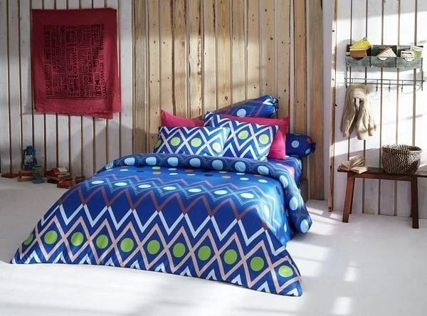 Màu xanh của bộ sản phẩm kích thước 160×200 cm tôn lên được vẻ phóng khoáng năng động hiện đại như hiện nay. Với chất liệu này trong quá trình sử dụng màu sắc của sản phẩm không bị phai màu dùng như mới. Hoạ tiết của bộ sản phẩm drap hình zic zắc màu sắc chủ đạo làm nền cho sản phẩm lại được các nhà thiết kế chọn đậm nhạt phối hai màu xanh và vàng nổi bật hơn để lôi cuốn các khách hàng ngay từ lần đầu nhìn thấy sản phẩm.