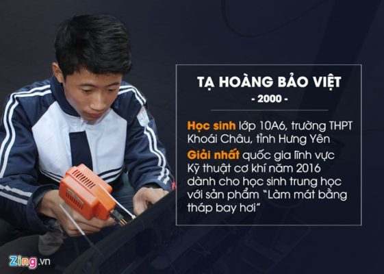 Hệ thống làm mát bằng tháp bay hơi đã khiến nhiều người tò mò này do Tạ Hoàng Bảo Việt, nam sinh trường THPT Khoái Châu, Hưng Yên chế tạo. Sau gần một năm mày mò, nghiên cứu, em đã hoàn thành sản phẩm “Làm mát bằng tháp bay hơi”. Sáng chế của em đã giành được giải nhất trong lĩnh vực cơ khí tại cuộc thi Khoa học kỹ thuật quốc gia 2016 vừa qua.