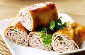 - Váng đậu chia thành 2 phần, cho nhân thịt vào cuộn lại, bên ngoài bọc vỏ bánh. Sau đó cắt khúc dài 3cm, cho bánh vào chảo dầu rán chín vàng là được.