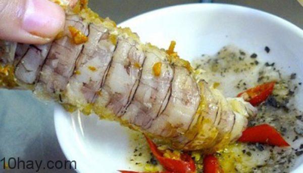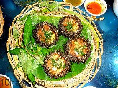 Cầu gai hay còn được gọi với cái tên khác là nhum biển. Đây chính là món ngon Phú Quốc vô cùng độc đáo mà bất kỳ ai đến đây tuyệt đối đừng nên bỏ qua. Món đặc sản này không đơn thuần chỉ là một món ăn ngon mà còn được ví như nhân sâm của biển với tác dụng tráng dương, bổ thận rất có lợi cho phái mạnh. Người Phú Quốc thường dùng cầu gai để nấu cháo hoặc nướng mỡ hành, thậm chí nhiều người còn thích ăn sống. Thật vậy, để ăn sống, thông thường chúng ta cần chọn những con cầu gai còn tươi ngon vừa mới được bắt từ dưới biển lên. Sau đó, cầu gai được gỡ đôi ra, rửa thật sạch cho hết các sợi gân máu bên trong để giảm độ tanh. Cho phần thịt cầu gai vào chén, vắt vài lát chanh và thêm một ít mù tạt, đánh thật đều là có thể thưởng thức cùng bắp cải bẹ xanh. Nghe có vẻ lạ lẫm nhưng hương vị thì không hề tệ đâu nhé. Tuy nhiên, dẫu biết ngon nhưng nghe đến ăn sống là nhiều người đã không thể đụng đũa để tận hưởng mùi vị của nó rồi. Vậy nên, món ăn phổ biến nhất từ cầu gai tất nhiên vẫn là cầu gai nướng. Vô cùng đơn giản, cầu gai chỉ cần nướng sơ lên rồi lấy muỗng nạo phần thịt ra và chấm với muối tiêu chanh, tốt nhất là thêm ít lạc rang rắc lên trên nữa là ngay lập tức, ta có ngay món cầu gai nương thơm nức mũi cùng vị béo ngậy quyến rũ.