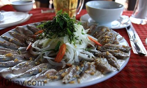 Sẽ là vô cùng thiếu sót nếu chuyến phượt Phú Quốc mà thiếu đi một dĩa gỏi cá trích- món ngon Phú Quốc nổi tiếng bậc nhất. Để chế biến món ăn một cách bắt vị nhất, dân đảo thường phải lựa chọn những con cá trích tươi ngon, béo tròn vừa được bắt lên còn lấp lánh ánh bạc để chế biến gỏi. Trước tiên, vảy cá được đánh sạch rồi rửa cá kỹ càng để lấy phần thịt phi lê. Món gỏi cá chế biến thì đơn giản nhưng không hề dễ dàng bởi cần một sự tinh tế và chăm chút, tỉ mỉ. Ngoài thịt cá ra, những thực phẩm được trộn chung bào gồm dừa nạo cùng hành tây thái mỏng và hành tím thêm những lát ớt thái sợi. Không chỉ vậy, nước sốt của món hải sản này cũng rất đặc biệt. Người dân thường dùng một loại giấm được nuôi bằng những trái ổi chín trên đảo để làm nước sốt nhằm tạo nên vị chua thanh đặc trưng cùng hương thơm thoang thoảng nhẹ nhàng mà say đắm lòng người. Hoàn tất công đoạn chế biến, bày ra đĩa là có thể dùng ngay với một chén nước chấm cay cuốn thêm bánh tráng, rau sống các loại. Hơn nữa, cá trích nhiều rẻ lại còn thơm ngon nhất là vào những tháng hè, khi mà lượng khách du lịch đổ về đây ở mức cao nhất trong năm. Do đó, chắc chắn rằng bạn đã liệt kê món này vào thực đơn trước khi xác balo lên và đi, các phượt thủ nhé !