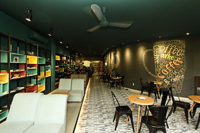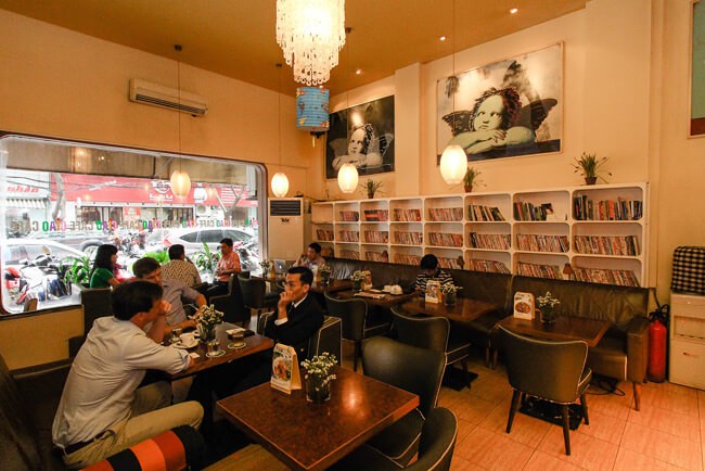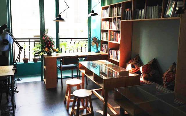 Đây là quán café sách với không gian rộng rãi và ấm cúng với những chiếc đèn chụp ánh vàng theo phong cách cổ điển. Quán có hai lầu, lầu trên yên tĩnh hơn nên dành cho các bạn học sinh ôn bài. Lầu dưới hơi ồn những lúc quán đông khách. Quán như một thư viện thu nhỏ vì kệ sách ở tầng trệt rất lớn. Sách từ dưới đất tràn tới trần nhà và đủ mọi chủ đề, cả từ điển cũng có nhé.